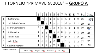 Terminou a fase de grupos do torneio "Primavera 2018". Seguir-se-ão os jogos que definirão a tabela classificativa geral final. No entanto, uma vez que se regista um empate no primeiro lugar do grupo A entre Pedro Cachorreiro e Rui Miranda, terá de haver lugar a um desempate entre estes dois jogadores de forma a perceber quem jogará com Fernando Azevedo (vencedor do grupo B) e que, com ele, disputará a vitória na prova.